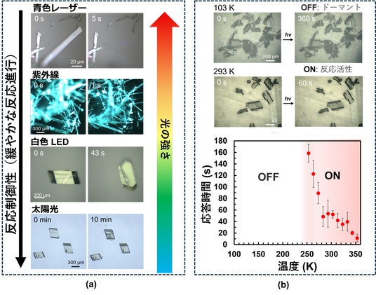 図1 (a) 4種類の光を照射したときの照射前後の結晶の写真(例えば、青色レーザーの場合は、照射5秒後に一部の結晶が画面外へと跳び出しているが、太陽光の場合は10分が経過しても、ほとんど変化が見られない) (b) 加熱温度による反応の進行状況と応答時間の違い(0 ℃=273.15 K)