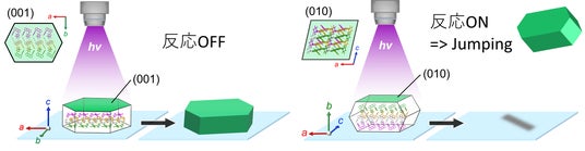 さらに、研究グループは、分子が光を吸収する際の遷移双極子モーメント μ (*6)が結晶内で常に異方性(*7)を示すことに着目。光の入射方向を変えたところ、結晶が飛び跳ねるなどの動的挙動の頻度が顕著に変化することを確認しました(図4)。