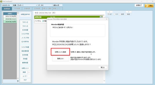 1.Wonderに登録されている患者の主訴を、ペットクルーカルテの診察記録に自動転記できる