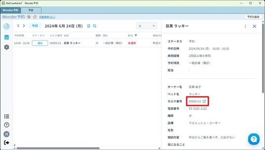 2.Wonderのカルテ番号の横にあるアイコンをクリックすると、ペットクルーカルテの顧客ページに遷移できる