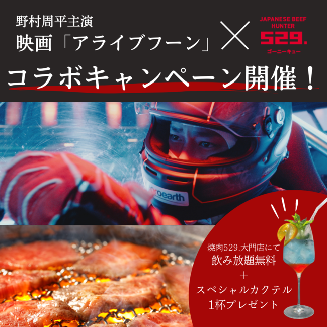 映画「ALIVEHOON アライブフーン」の公開期間中、「YAKINIKU 529.」大門店にご来店いただき、店舗スタッフに【「ALIVEHOON アライブフーン」を観た】とお伝えいただくと、生ビール、ワインを含む計20種類以上のドリンクが無料で飲み放題となるキャンペーンです。また、本キャンペーンにご参加いただくと、特別にスペシャルカクテルが1杯付きます。キャンペーン開始日は2022年6月10日(金)となります。