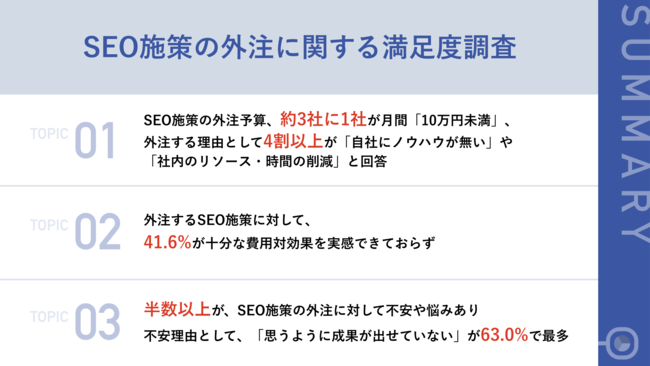 SEO施策を外注する理由として、「自社にノウハウが無い」や「社内のリソース・時間の削減」と回答しており、外注予算として、約3社に1社が月間「10万円未満」と低コストで運用していることが分かりました。一方で、外注するSEO施策に対して、41.6%が十分な費用対効果を実感できていない実態も明らかに。