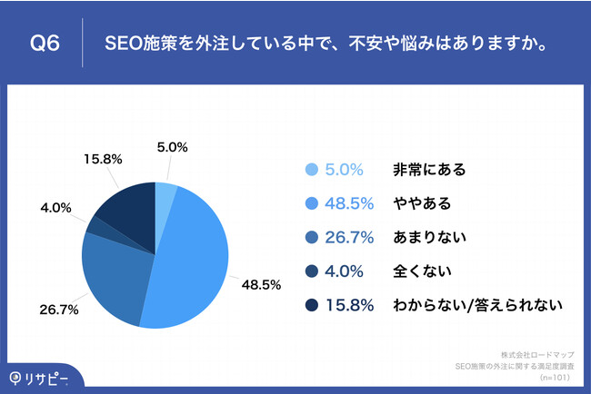 「Q6.SEO施策を外注している中で、不安や悩みはありますか。」(n=101)と質問したところ、「非常にある」が5.0%、「ややある」が48.5%という回答となりました。