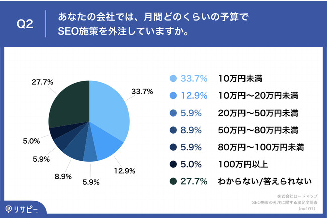 「Q2.あなたの会社では、月間どのくらいの予算でSEO施策を外注していますか。」(n=101)と質問したところ、「10万円未満」が33.7%、「10万円~20万円未満」が12.9%という回答となりました。