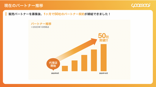 募集開始から1ヶ月で税理士・社労士事務所(士業)や保険代理店、広告代理店、Web制作会社、フリーランスなどを中心に、50社の販売パートナー様との締結に至りました。