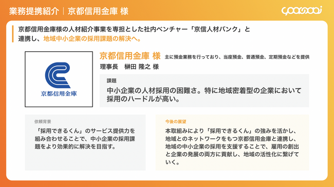 これまで、業種・業界を問わずに幅広い中小企業の採用支援実績があり、2023年10月には京都信用金庫社との業務提携に至るまでになりました。