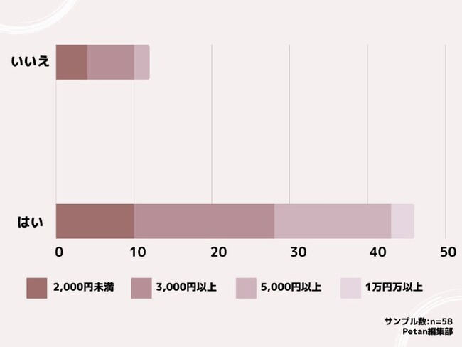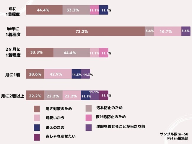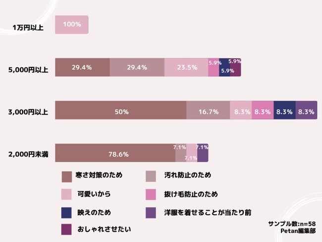 「寒さ対策のため」と回答した方は2,000円~3,000円代の洋服を購入することがほとんどという結果に。「可愛いから」「映えのため」「おしゃれさせたい」など飼い主の欲求が目的の場合、3,000円以上の洋服を購入する傾向がみえます。