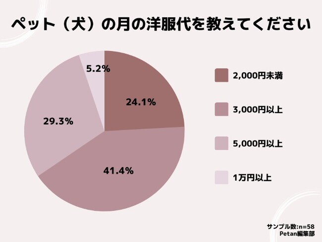 「犬に洋服を着せている」という方に、月の犬の洋服代について質問したところ、ほぼ半数は3,000円以上(41.38%)の洋服を購入することがわかりました。犬の洋服の値段はブランドやサイズにより大きく異なりますが相場は2,000~7,000円ほど。犬の洋服においては1着3,000円は比較的安い方に入るかもしれません。