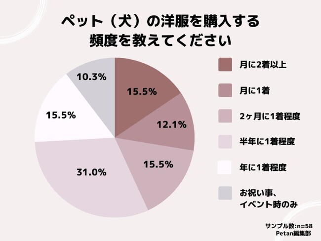 多くの方は「半年に1着(31.03%)」程度購入。年に1着程度(15.52%)しか購入しない方がいる一方で「月に1着以上購入する方」は27%と約4人に1人が毎月愛犬の洋服を購入していることがわかりました。ここから愛犬の洋服に対する考え方が高まっていることが伺えます。