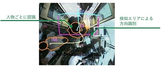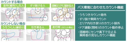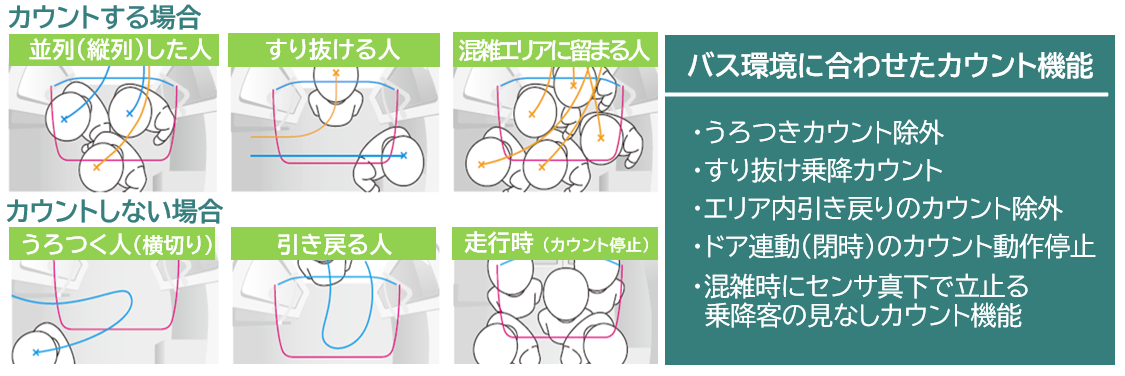 バス乗降時における特有の人の動きをパターン化し、正確にカウントします。
