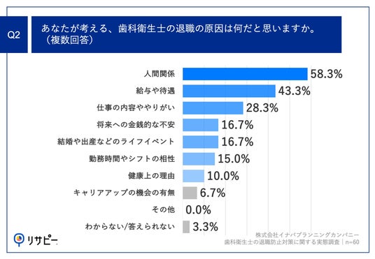 Q1で「0人」「わからない/答えられない」以外を回答した方に、「Q2.あなたが考える、歯科衛生士の退職の原因は何だと思いますか。(複数回答)」(n=60)と質問したところ、「人間関係」が58.3%、「給与や待遇」が43.3%、「仕事の内容ややりがい」が28.3%という回答となりました。
