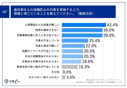 Q6で「かなりある」「ややある」と回答した方に、「Q7.歯科衛生士の退職防止の対策を実施する上で、課題と感じていることを教えてください。(複数回答)」(n=59)と質問したところ、「人間関係などの改善が難しい」が42.4%、「時間の確保できない」が39.0%、「労働環境改善に伴う人手が足りない」が39.0%という回答となりました。