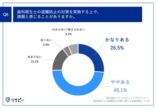 Q4で「特にない」「わからない/答えられない」以外を回答した方に、「Q6.歯科衛生士の退職防止の対策を実施する上で、課題と感じることがありますか。」(n=79)と質問したところ、「かなりある」が26.5%、「ややある」が48.1%という回答となりました。
