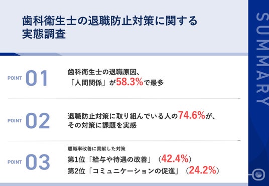 まず、歯科クリニックの約6割が、直近1年で歯科衛生士の退職を経験しており、その退職原因では、「人間関係」が58.3%で最多となりました。また、歯科衛生士の退職防止のために実施している対策としては、「給与や待遇の改善」(53.5%)や「コミュニケーションの促進」(33.7%)が挙げられています。一方で、こうした対策を実施する上で、74.6%が課題を実感しており、具体的な課題では、「人間関係などの改善が難しい」(42.4%)が上位になりました。さらに、41.8%が、退職防止対策により「離職率が減少した」と回答し、離職率改善に貢献した対策としては、第1位「給与や待遇の改善」(42.4%)、第2位「コミュニケーションの促進」(24.2%)の結果が出ています。