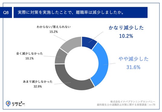 Q4で「特にない」「わからない/答えられない」以外を回答した方に、「Q8.実際に対策を実施したことで、離職率は減少しましたか。」(n=79)と質問したところ、「かなり減少した」が10.2%、「やや減少した」が31.6%という回答となりました。