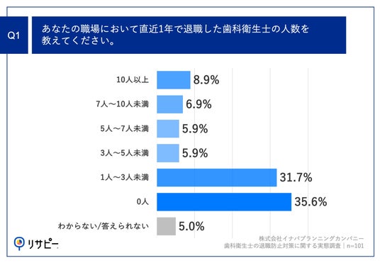 「Q1.あなたの職場において直近1年で退職した歯科衛生士の人数を教えてください。」(n=101)と質問したところ、「0人」が35.6%、「1人~3人未満」が31.7%、「10人以上」が8.9%という回答となりました。