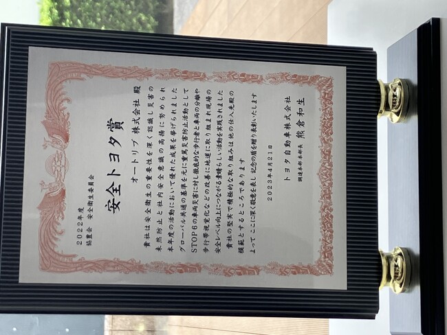この賞は、トヨタ自動車株式会社とその協力会社で構成する協豊会約200社の中から、自社の現場における安全衛生に優れた活動を実践された企業に贈られる賞です。グローバル共通の基準を元に重篤災害防止活動としてSTOP6の車両災害に対し徹底的な歩行者と車両の分離や歩行帯視覚化などの改善に関する当社の取り組みを、現場の安全レベルの向上につながる活動として評価いただきました。