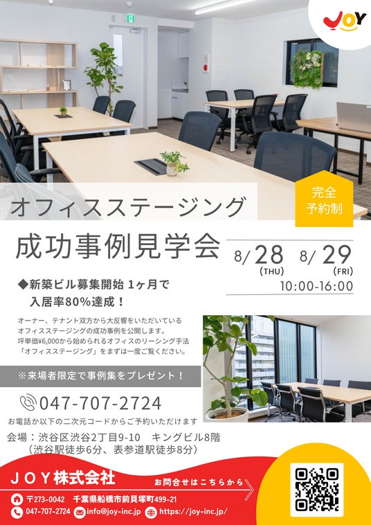 首都圏を中心に主要都市でオフィスのリーシングサービス「オフィスステージング」を展開する、JOY株式会社(所在地:千葉県船橋市、代表取締役:福士知志)は、2025年8月28日(木)・29日(金)の2日間、オフィスステージングによって新築1棟ビルが1カ月で80%入居を達成した成功事例の現地見学会を開催いたします。
