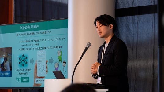 医学系研究科とAI技術の知識を活かしたフレイルの予測AIモデルを作る取り組みを行っています。説明させていただいたアプリを多くの高齢者の方に使っていただき、結果的に社会に貢献できるような仕組みを作っていきたいと思っています。引き続き応援のほどよろしくお願いいたします。