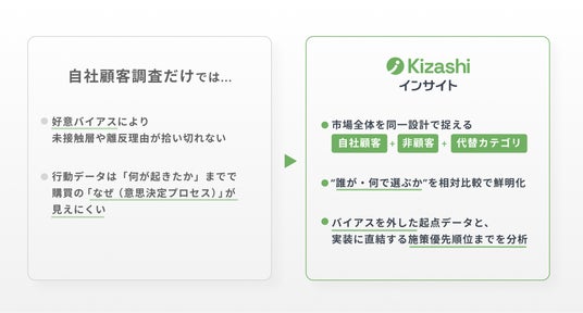 一方で、従来の本格的な市場調査は時間とコストの壁が高く、着手を先送りしやすい課題がありました。こうした状況を踏まえ、『Kizashiインサイト』は、市場全体(自社顧客+非顧客+代替カテゴリ)を同一設計で捉え、“誰が/何で選ぶか”を相対比較で鮮明化するクイック市場調査として提供します。最短2週間で、バイアスを外した起点データと、実装に直結する施策優先順位までを分析します。