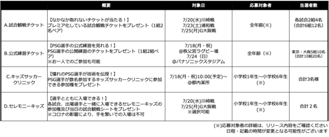 PSGジャパンツアー中に行われる各試合の開幕セレモニーで出場選手と一緒に入場できる権利が当たります。