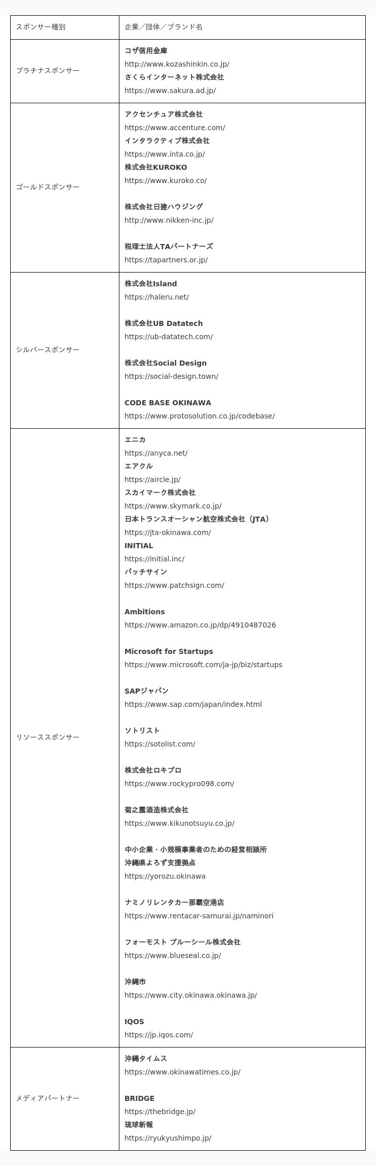 その他にも県内外を問わず、沖縄のスタートアップ発展への想いを共にする企業/団体がスポンサーとして決定しています。