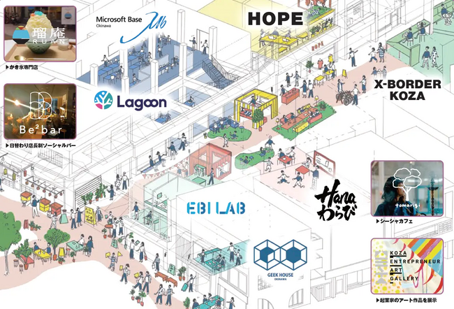 コザスタートアップ商店街は、多様な挑戦者の拠点の集積地として、コワーキングスペースやシェアオフィス、スタートアップや県内外企業のオフィス、エンジニア向けのシェアハウス、ワーケーション向けホテル、ソーシャルバー、アートギャラリー、フリースクール等、多様な場から構成されています。「世界にイノベーションを起こす挑戦者を生み出す商店街」を目指し、沖縄発のスタートアップや挑戦者の成長の土台として人や資本を行き来させるプラットフォームとして成長を続けています。