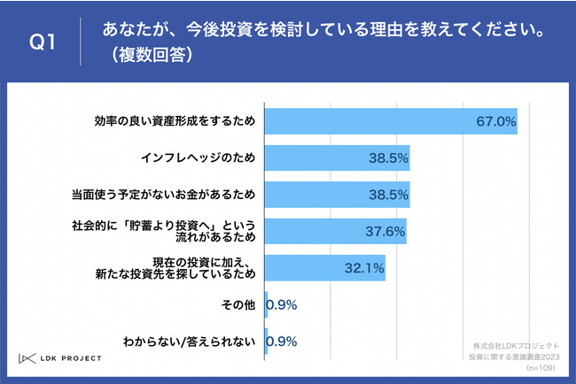 「Q1.あなたが、今後投資を検討している理由を教えてください。(複数回答)」(n=109)と質問したところ、「効率の良い資産形成をするため」が67.0%、「インフレヘッジのため」が38.5%、「当面使う予定がないお金があるため」が38.5%という回答となりました。