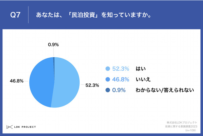 「Q7.あなたは、「民泊投資」を知っていますか。」(n=109)と質問したところ、「はい」が52.3%、「いいえ」が46.8%という回答となりました。