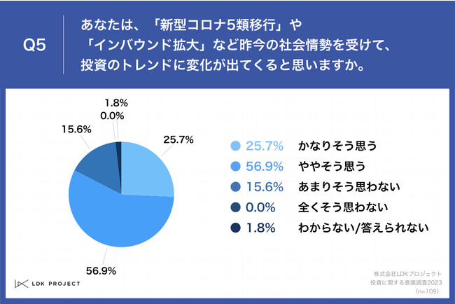 「Q5.あなたは、「新型コロナ5類移行」や「インバウンド拡大」など昨今の社会情勢を受けて、投資のトレンドに変化が出てくると思いますか。」(n=109)と質問したところ、「かなりそう思う」が25.7%、「ややそう思う」が56.9%という回答となりました。
