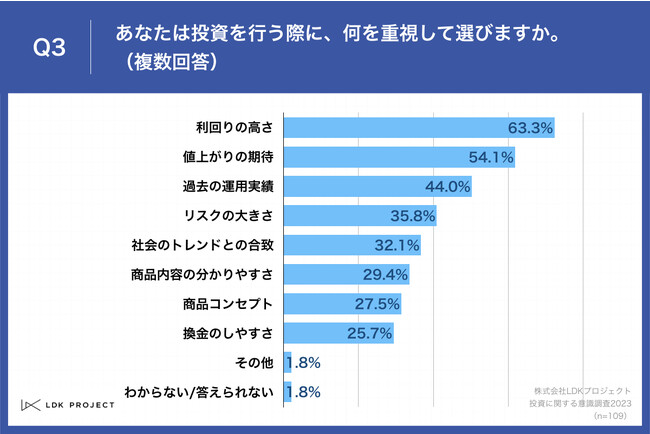 「Q3.あなたは投資を行う際に、何を重視して選びますか。(複数回答)」(n=109)と質問したところ、「利回りの高さ」が63.3%、「値上がりの期待」が54.1%、「過去の運用実績」が44.0%という回答となりました。