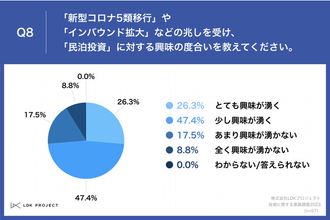 Q7で「はい」と回答した方に、「Q8.「新型コロナ5類移行」や「インバウンド拡大」などの兆しを受け、「民泊投資」に対する興味の度合いを教えてください。」(n=57)と質問したところ、「とても興味が湧く」が26.3%、「少し興味が湧く」が47.4%という回答となりました。