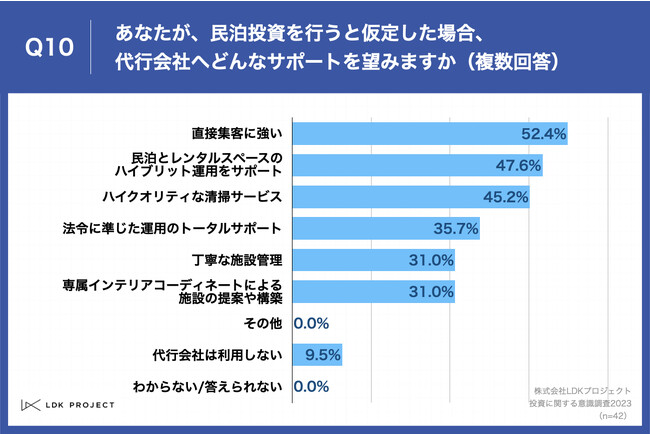 Q8で「とても興味が湧く」「少し興味が湧く」と回答した方に、「Q10.あなたが、民泊投資を行うと仮定した場合、代行会社へどんなサポートを望みますか(複数回答)」(n=42)と質問したところ、「直接集客に強い」が52.4%、「民泊とレンタルスペースのハイブリット運用をサポート」が47.6%、「ハイクオリティな清掃サービス」が45.2%という回答となりました。