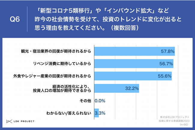 Q5で「かなりそう思う」「ややそう思う」と回答した方に、「Q6.「新型コロナ5類移行」や「インバウンド拡大」など昨今の社会情勢を受けて、投資のトレンドに変化が出ると思う理由を教えてください。(複数回答)」(n=90)と質問したところ、「観光・宿泊業界の回復が期待されるから」が57.8%、「リベンジ消費に期待しているから」が56.7%、「外食やレジャー産業の回復が期待されるから」が55.6%という回答となりました。