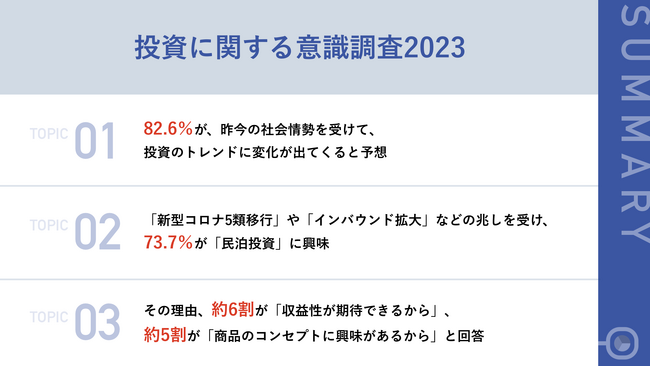 82.6%が、「新型コロナ5類移行」や「インバウンド拡大」などの社会情勢を受けて、投資のトレンドに変化が出てくると実感