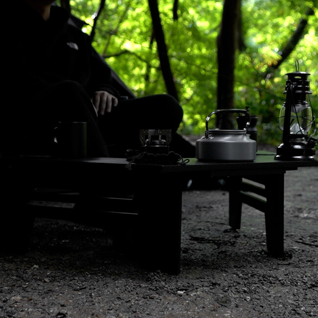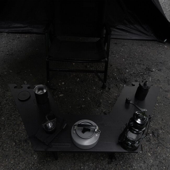 キャンプサイトがグッと引き締まる、格好いいレイアウトになること間違い無しのキャンプテーブルです。
