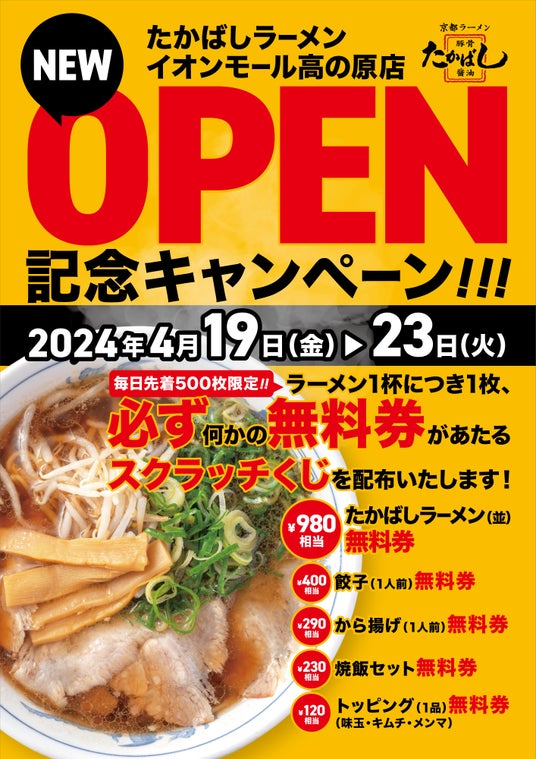 たかばしラーメンイオンモール高の原店が2024年4月19日イオンモール高の原4Fフードコート内にグランドオープン致します!