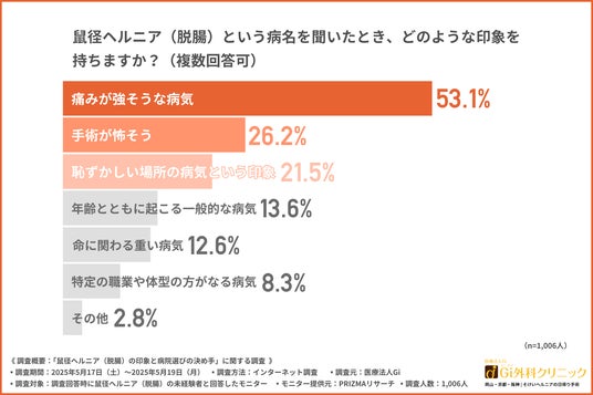 『痛みが強そうな病気』という回答が約半数になり、名前の響きや「脱腸」という表現からくる視覚的なイメージに起因している可能性があります。