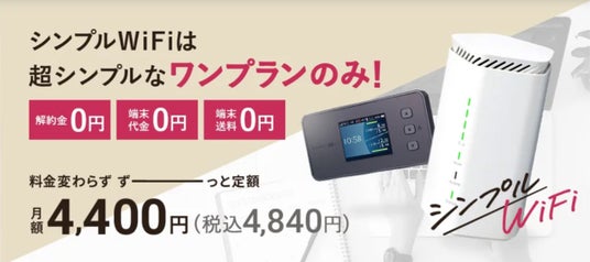解約金0円、端末代金0円、端末送料0円、料金変わらず、ずーっと定額月額4,400円(税込4,840円)の超シンプルなワンプランのみのWiFiです。