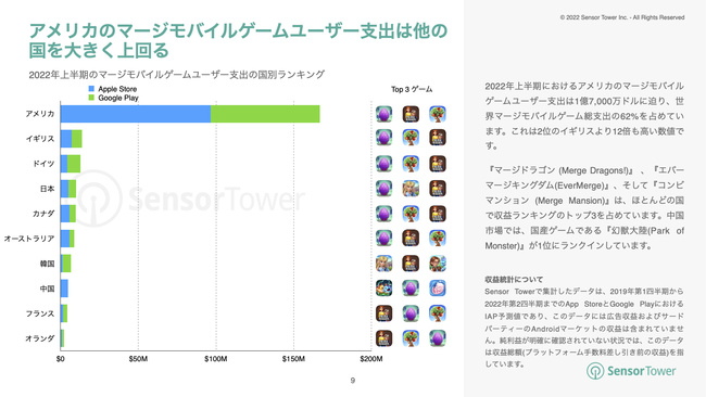 2022年上半期アメリカのマージモバイルゲームのユーザー支出は1億7,000万ドルに迫り、世界におけるマージモバイルゲーム総支出の62%を占めています。これは2位のイギリスより12倍も高い数値です。『マージドラゴン (Merge Dragons!)』 、『エバーマージキングダム(EverMerge)』、『コンビマンション (Merge Mansion)』は、ほとんどの国で収益TOP3を占めています。