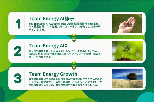 共経営で1,000社の会社設立を目指すTeam Energyグループ(代表者:中村誠司、所在地:大阪府大阪市)は、新会社「Team Energy AI総研」「Team Energy AIX」を設立し、既存の「Team Energy」から社名変更して「Team Energy Growth」の中間持株会社に体制変更したことをお知らせいたします。