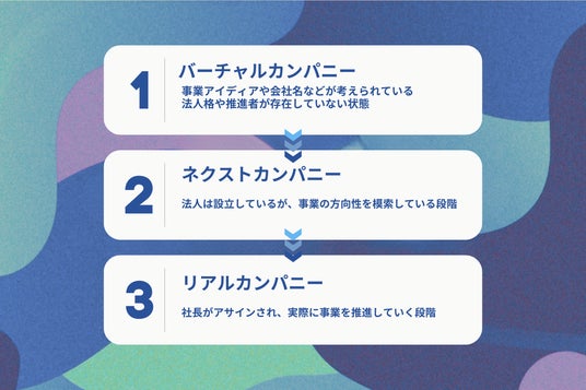 会社づくりは「バーチャルカンパニー」「ネクストカンパニー」「リアルカンパニー」の三段階で進められ、世界で伸びている事業・産業に対していち早くアクションを起こすことができる体制となっています。