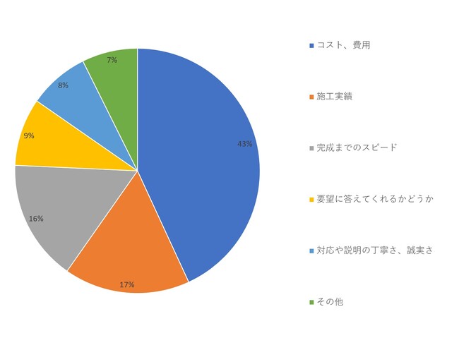 続いて「内装業者を選ぶ際に最も重視するポイントを教えてください」という質問では、「コスト・費用」が43パーセントを占め、最も多い割合となりました。