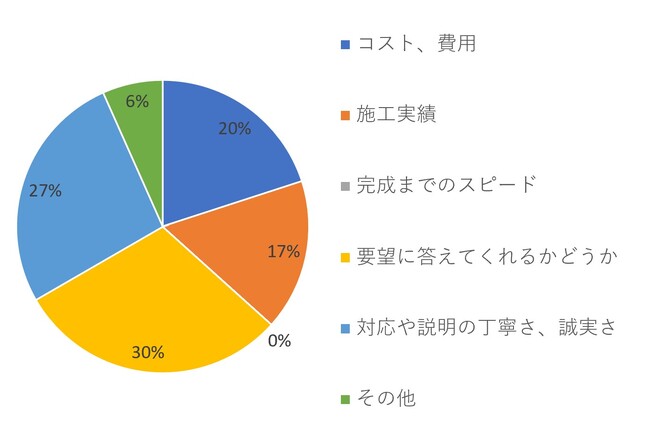 一方で【500~1000万円】では、「要望に答えてくれるかどうか」が30パーセントでトップ、「対応や説明の丁寧さ、誠実さ」が27パーセント、「コスト、費用」が20パーセントという結果になりました。