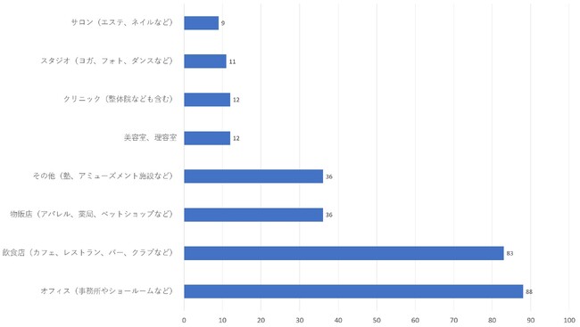 回答全体の得票数は、第1位のオフィスと第2位の飲食店の層がボリュームゾーン、続いて第3位の物販店とその他の層、第5位以降の層の3つに分かれる結果となりました。