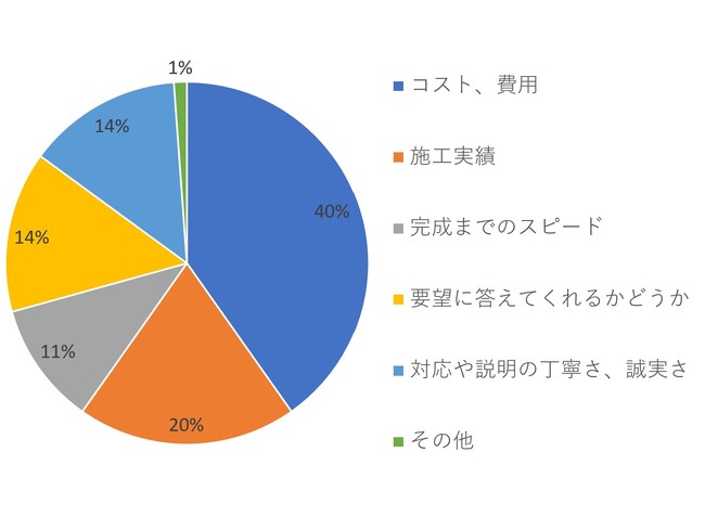 【~300万円】では、「コスト、費用」が40パーセント、「施工実績」が20パーセント、そして「要望に答えてくれるかどうか」と「対応や説明の丁寧さ、誠実さ」が並んで14パーセントという結果になりました。
