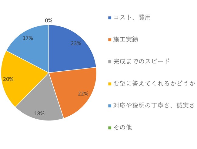 【300~500万円】では、「コスト、費用」が23パーセント、「施工実績」が22パーセント、そして「要望に答えてくれるかどうか」が20パーセントという結果になりました。【~300万円】と比べても大きな違いは見られません。