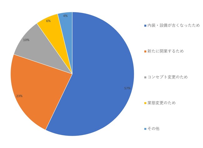 そして、「内装・改装を業者に依頼したきっかけを教えてください」という設問では、「内装・設備が古くなったため」が57パーセントを占め、最も多い割合となりました。