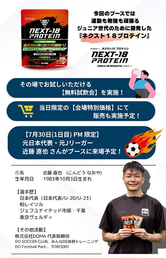 元サッカー日本代表・元Jリーガー、現ジュニアユース(DO SOCCER CLUB代表)の近藤直也さんが、サプリメント・化粧品メーカーである株式会社Hongo(本社:東京都文京区/代表取締役:村田 聡)の「NEXT-18 PROTEIN」公式アンバサダーに就任いたしました。