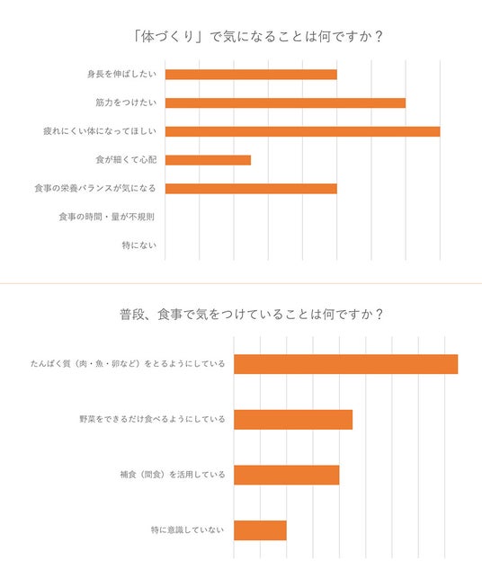 「疲れにくい体になってほしい」「筋力をつけたい」「身長を伸ばしたい」「食事の栄養バランスが気になる」が多く選ばれました。